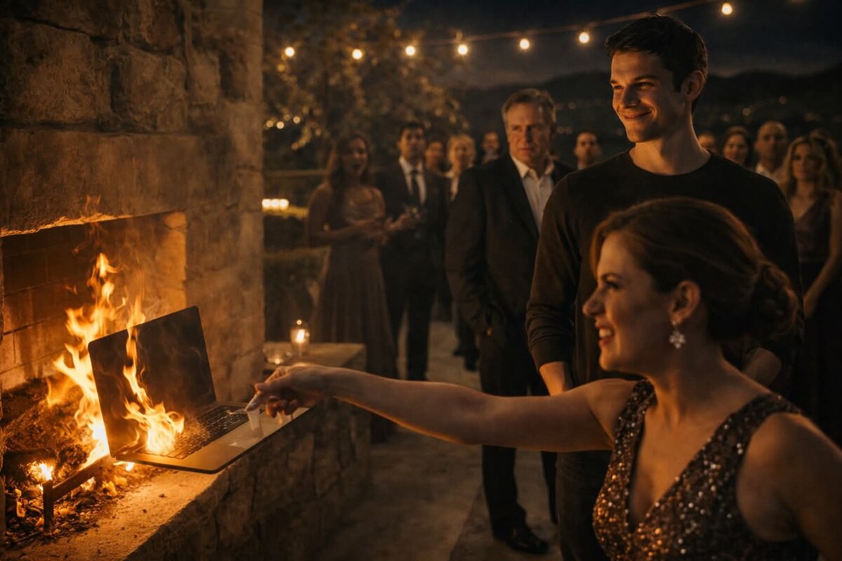 Я смотрел на огонь несколько секунд дольше, чем нужно. Хруст пластика, резкий запах горячего металла, отражение пламени в бокалах с вином. Никто не заметил, что мой смех был не нервным и не покорным. Это было облегчение. Смех человека, который только что с жестокой ясностью понял, что больше не принадлежит этому месту.