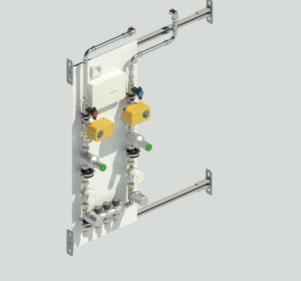 Для кухни. Сами рисуем, сами комплектуем, сами собираем. Индивидуально. В данном случае ширина 350мм Sanha, Oventrop, Uni-Fitt, Neptun, Valtec, Far, Stout, Рехау. Кронштейн коллектора также сами смоделировали и напечатали. Под алюминием водостойкая ламинированная фанера 9мм. Крепко, жестко. Можно сделать в брутальном черном мате.