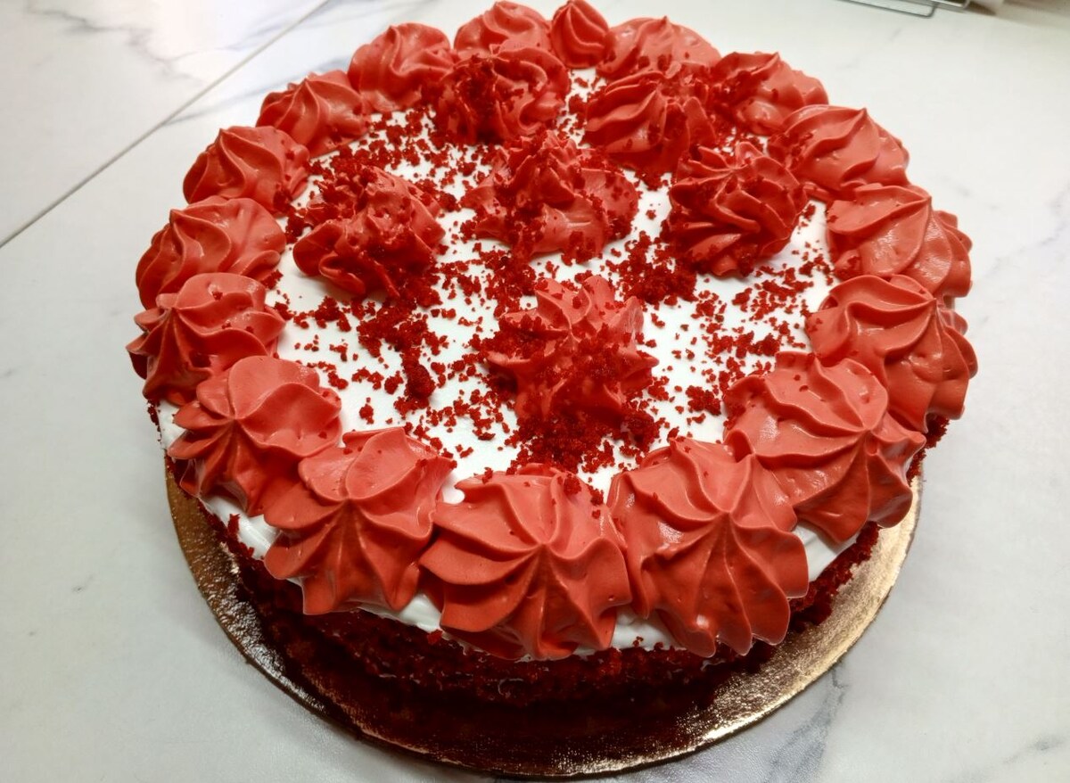 Впервые испекла этот торт три года назад. 5-тилетний внук был для меня самым важным ценителем вкуса. Теперь ему восемь, но восхищение осталось таким же, сначала от цвета, затем - от вкуса. В этот раз я испекла не три, а два бисквитных коржа. Оказывается, так тоже можно, в последствии разрезать их на два и получится 4 коржа. Чтобы меньше пачкать посуды, можно сразу в одной миске сахар соединить с солью, муку с содой, разрыхлителем и какао, в ряженку или кефир влить красный краситель. Все хорошо перемешать (по мискам). Яйца также взбивала в планетарном миксере в течение 10 минут на максимальной скорости, только первую минуту - на скорости между 1 и 2. Затем добавила в ряженку с красителем растительное масло. НО следует заметить, что эти две жидкости не соединяются, они разные по плотности. Поэтому, теперь я уже понимаю, что в тесто после взбивания яиц можно сразу в один прием добавить масло и ряженку (или кефир), перемешать, а вот муку вводить следует в три приема, чтобы не было непромес