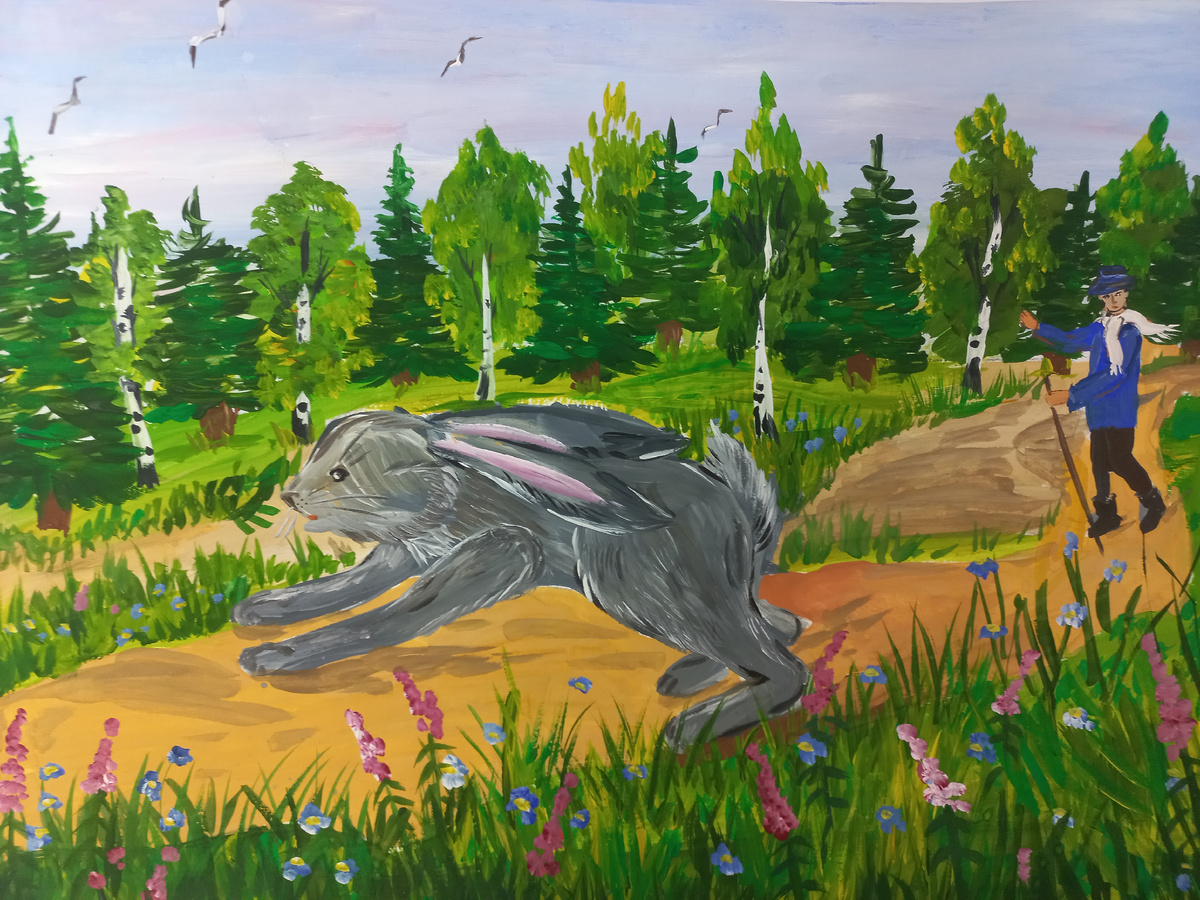 Описание: Мне нравятся стихи Н.М. Рубцова. Они легко воспринимаются и запоминаются. В своей работе я передал сюжет из стихотворения "Про зайца", где заяц с перепугу поскакал в лесок сосновый, слыша веселый крик автора. Мне было интересно передать чувства, позы героев и все, что их окружает.