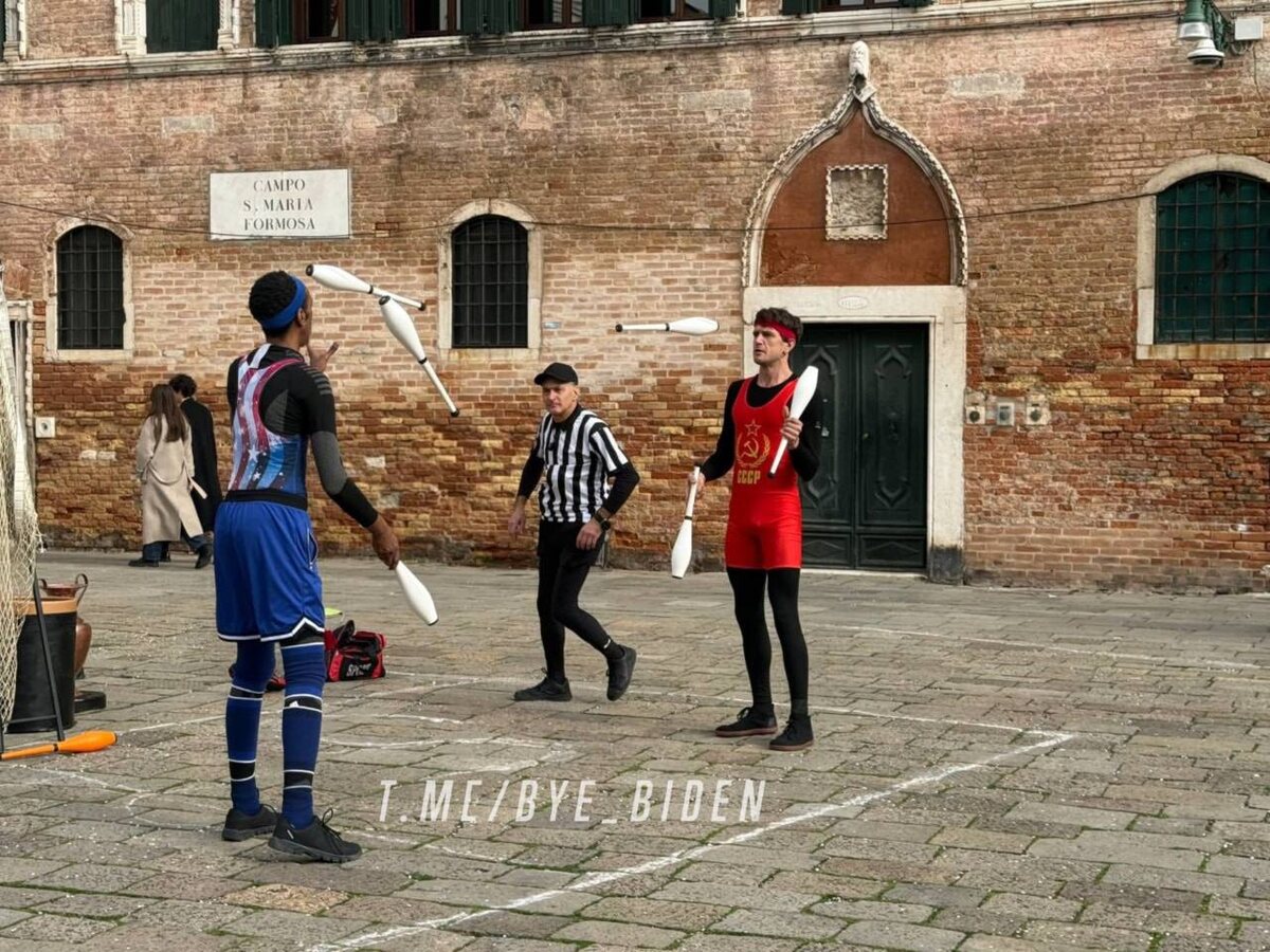 На карнавале в Венеции жонглеры изобразили холодную войну между США и СССР, кидая друг другу кегли