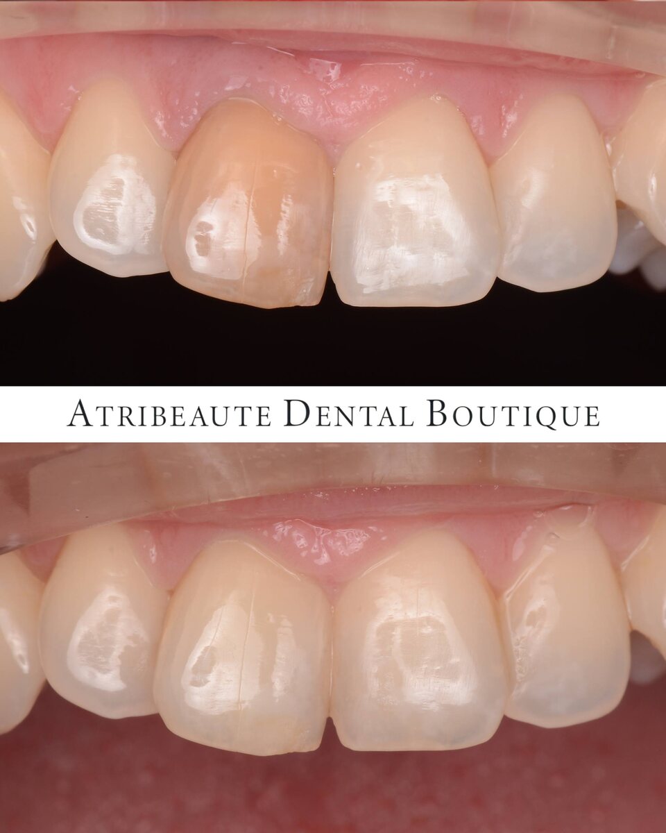 Пациентку беспокоил тёмный цвет одного из передних зубов. Он резко контрастировал с соседними зубами, которые имели красивый, благородный оттенок, из-за чего улыбка выглядела негармонично. 💙 В ходе подготовки к внутрикоронковому отбеливанию мы всегда оцениваем состояние корневого канала. В данном случае потребовалось его перелечивание: важно, чтобы канал был чистым, плотно и качественно запломбирован. Только после этого можно безопасно переходить к этапу отбеливания зуба изнутри. ✔️ Сегодня мы оцениваем отсроченный результат спустя около трёх месяцев. Цвет зуба стабилен, гармонично сочетается с соседними, а улыбка выглядит естественно и аккуратно. Для пациентки это стало долгожданным преображением — она долгое время не знала, как решить эту проблему, рассматривала варианты виниров или коронок, но именно этот метод позволил вернуть естественную эстетику собственного зуба без протезирования ⚕ Автор кейса: Узакова Маргарита Маратовна — стоматолог-терапевт Atribeaute #atribeaute_denta