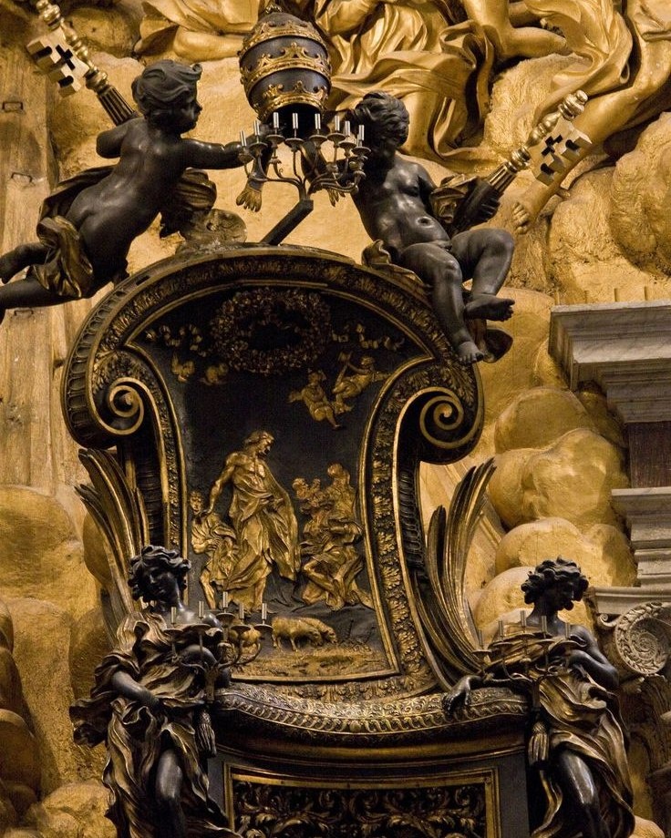 Создан в 1666 году. На фото от heritagematterz видно, что трон окружен фигурами ангелов. Он также поддерживается статуями четырех великих Учителей Церкви. Это часть композиции в алтарном пространстве собора Святого Петра в Ватикане. Подписаться на канал: 📱 Telegram / 💜 MAX / все наши каналы