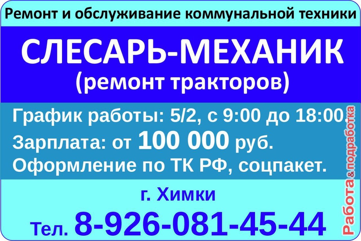 ! 🔥 ✅ Что мы предлагаем: - Став мастером нашего автосервиса, вы получите стабильную работу с достойной оплатой труда — от 100 000 рублей в месяц. - Официальное трудоустройство и полный соцпакет — заботимся о вашем будущем и настоящем. - Удобный график работы: 5 дней в неделю, с 9:00 до 18:00 — больше времени на отдых и личные дела. - Уютный город Химки — здесь комфортно работать и жить. 🔧 Почему выбирают нас: - Наша техника ждет вашего таланта! Восстанавливайте тракторную технику, которая нуждается в надежных руках. - Команда профессионалов, которые ценят мастерство и ответственность. - Возможность развивать свои навыки и осваивать новые горизонты. 📌 Какой специалист нам нужен: - Опытный механик, который умеет не только чинить, но и предсказывать будущие поломки. - Человек, который понимает, насколько важна исправная техника для городских служб. 📞 Ждём вас в нашем дружном коллективе! Телефон для связи: 8-926-081-45-44