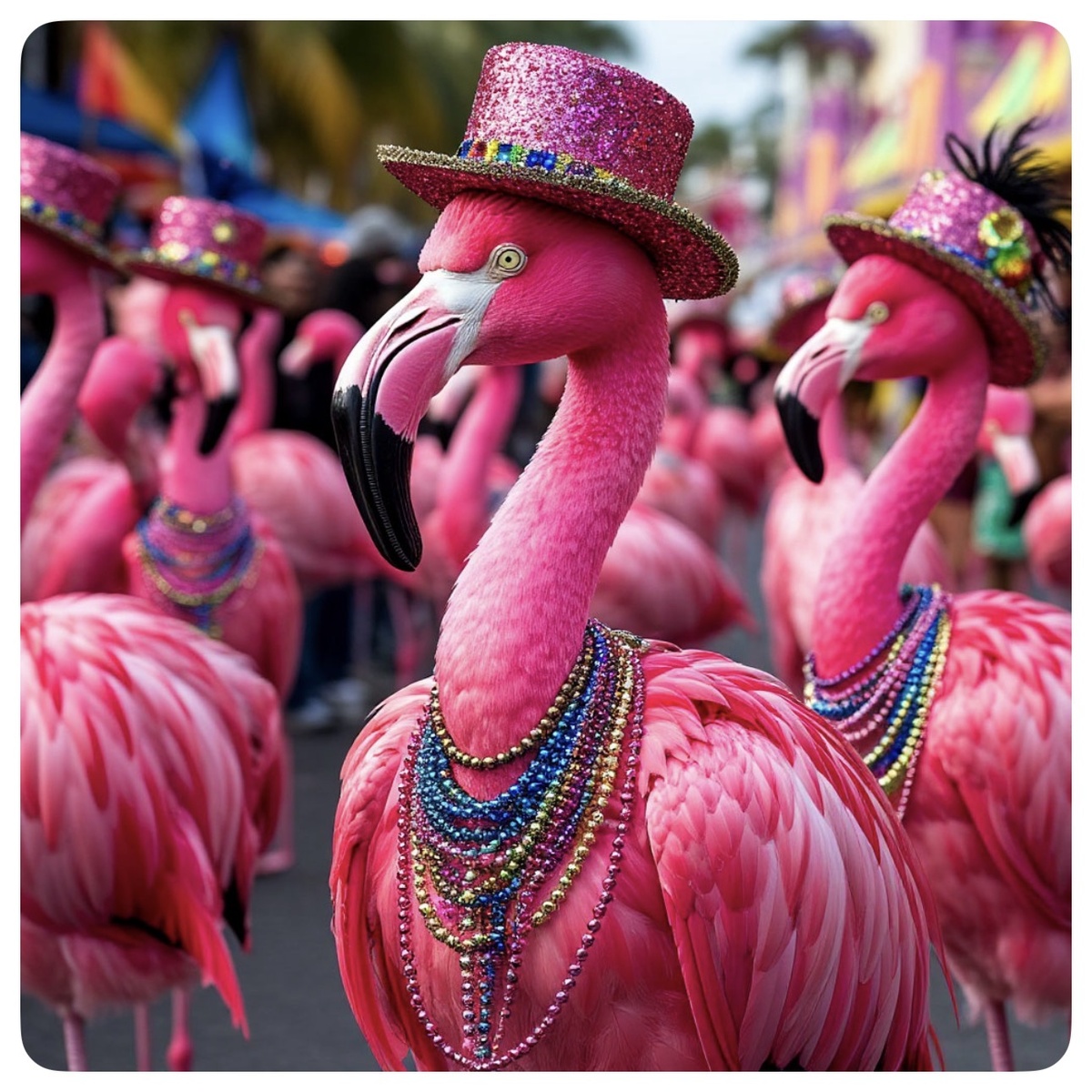 Перед парадом - задолго до парада - есть традиция: огромные деревянные фламинго «высаживаются» у университетских озёр LSU, и жители на лодках или вплавь по холодной воде «усыновляют» их себе домой — знак, что карнавал близко.