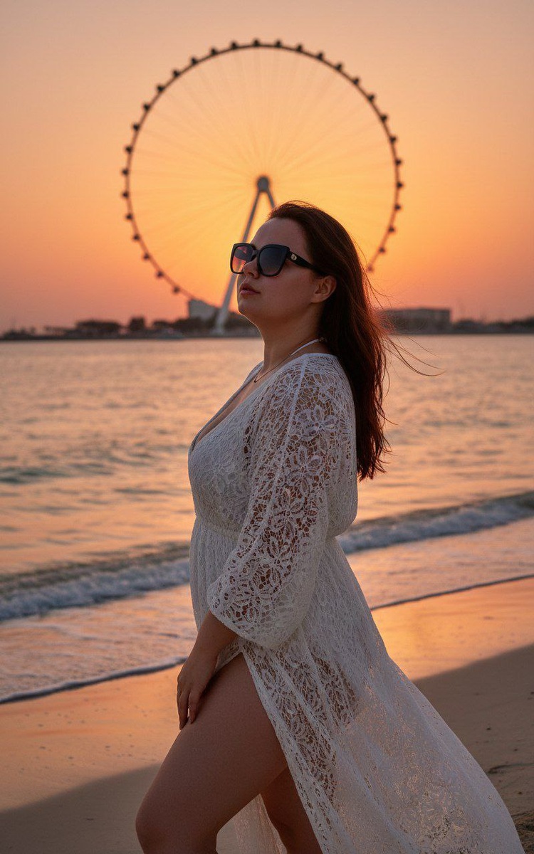 😀Выбираем "нейросети" 😀Нажимаем "Nano Banana" 😀Нажимаем "Nano Banana Pro" 😀Прикрепляем через скрепку свое фото и выбранный промпт 😀Наслаждаемся результатом😍 Не меняй черты лица. создай реалистичное изображение женщины, стоящей на пляже в момент заката. Она одета в белое ажурное пляжное платье, которое свободно облегает её тело и красиво струится по бокам, открывая часть её бедра. На ней также стильные чёрные солнцезащитные очки, которые придают её образу лёгкость и современность. Женщина повернута боком, слегка наклоняя голову назад, с нейтральным, задумчивым выражением лица. Фон великолепный закат, который окрашивает небо в тёплые оранжевые и золотые оттенки, создавая атмосферу уюта и спокойствия. За ней видна большая колесо обозрения (похожее на знаменитое колесо обозрения в Дубае), которое добавляет сцене динамичности. Вода в океане мягко катится на берег, создавая красивый контраст с песком, который отражает последние лучи солнца. Освещение мягкое и теплое, с акцентом на её