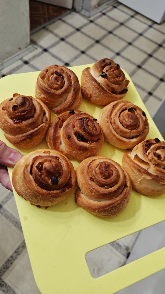 Всем доброго дня! Сегодня хочу поделиться рецептом слоеных улиток с малиной и изюмом. Я разбирал холодильник и обнаружил там тесто, остатки малинового варенья и немного изюма. Все это идеально подошло для приготовления вкусной и быстрой выпечки. Слоеное тесто, хоть и не премиального качества, отлично подошло для домашней выпечки и не требовало особого ухода. Возможно, если бы я раскатал тесто менее тонко, слои были бы более выраженными. Это тесто было от хлебного дома. Слоеное дрожжевое тесто является высококалорийным продуктом, содержащим около 330-400 ккал на 100 граммов, с высоким содержанием жиров (15-25%) и углеводов. Оно быстро дает энергию, но может содержать трансжиры (маргарин) и способствовать быстрому набору веса, а также нагружать поджелудочную железу и кишечник. Из-за дрожжей оно может вызывать вздутие. Размороженное тесто слегка раскатываем скалкой. На две трети пласта наносим малиновое варенье, сверху выкладываем размоченный изюм. Затем заворачиваем в рулет и нарезаем ег
