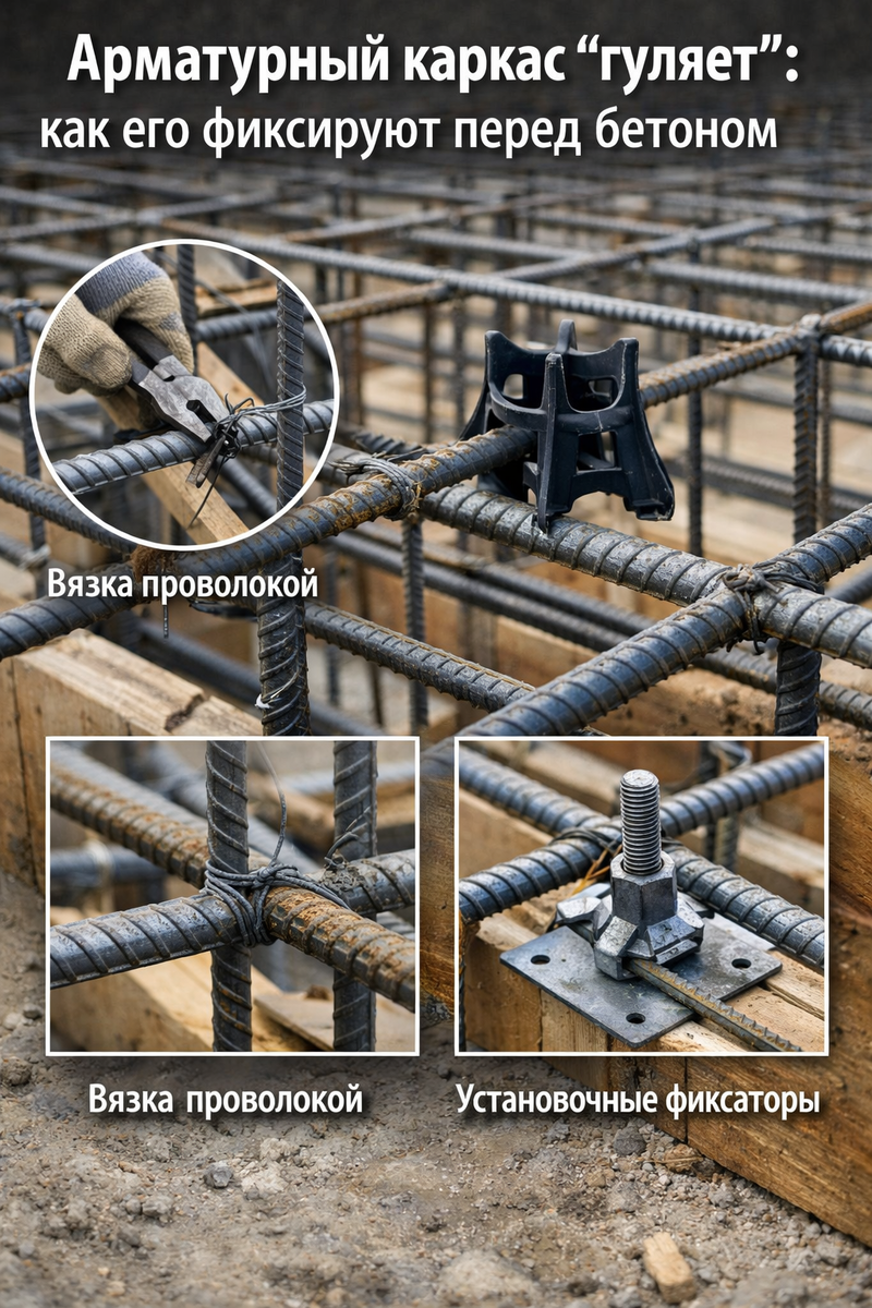 Есть одна ситуация, которую я вижу на объектах постоянно. Каркас связан аккуратно, размеры вроде соблюдены, фиксаторы стоят. Начинается заливка — и всё начинает «плыть». Сетка проседает, прутки расходятся, защитный слой исчезает. После схватывания уже поздно: конструкция зафиксировалась в неправильном положении. Именно так появляется проблема, которую потом описывают фразой «каркас сместился при заливке». Тема «фиксировать арматуру перед заливкой» — это не про перестраховку. Это про сохранение проектной геометрии до последней минуты бетонирования. Разберём, почему каркас уезжает и как этого избежать. Арматурный каркас до заливки — это лёгкая пространственная конструкция. Он держится только на вязке и опорах. Пока нет бетона, он уязвим. Во время бетонирования на него действуют сразу несколько факторов: — масса бетонной смеси;