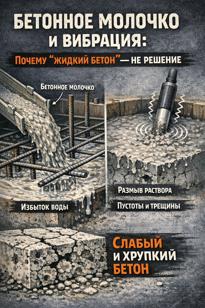 На стройке часто можно услышать фразу: «Давай водички плеснём — легче пойдёт». Особенно когда смесь кажется густой, тяжело укладывается, неохотно растекается по опалубке. И в этот момент принимается одно из самых вредных решений для будущего дома. Разбавленный бетон выглядит удобным. Он легко течёт, быстро заполняет форму, красиво «блестит». Но вместе с водой Вы смываете прочность, долговечность и устойчивость конструкции. Тема «почему нельзя разбавлять бетон водой» — это основа бетонных работ, которую почему-то до сих пор игнорируют. Разберём, что такое подвижность, зачем нужен пластификатор и какую роль реально играет вибратор. Бетон не должен быть ни сухим, ни «супом». У него есть рабочая консистенция — подвижность. В частном строительстве чаще всего применяют: — П2 — жёсткий;