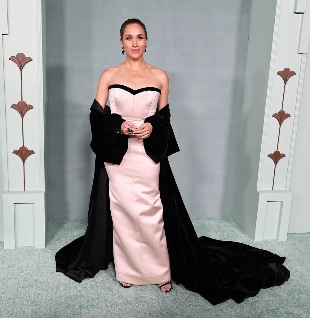 Супруга принца Гарри появилась одна на благотворительном мероприятии. Меган Маркл вновь оказалась в центре внимания, представив первый в этом году вечерний ансамбль на благотворительном мероприятии Fifteen Percent Pledge. Цель акции — поддержка темнокожих бизнесменов, и герцогиня Сассекская присоединилась к числу почетных гостей. Меган выбрала платье от Harbison Studio, которое балансировало между утонченностью и эффектностью. Пастельно-розовый оттенок ткани смягчал строгость силуэта, а декольте в форме сердца с черной окантовкой добавляло ноту контраста. Длинная юбка-колонна подчеркивала линию фигуры, а кульминацией образа стал бархатно-шелковый шлейф. Он ниспадал за спиной, напоминая вечернее пальто, и создавал атмосферу голливудской роскоши. Мероприятие предписывало дресс-код “черный галстук, темнокожий дизайнер”, и Меган строго следовала правилам, выбрав творение Чарльза Харбисона. Дизайнер позже поделился в соцсетях кадрами с вечера, назвав этот наряд одним из своих главных достиж