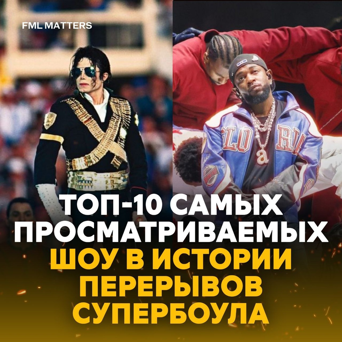 🔝 ТОП-10 САМЫХ ПРОСМАТРИВАЕМЫХ ШОУ В ИСТОРИИ ПЕРЕРЫВОВ СУПЕРБОУЛА! Кендрик Ламар в 2025 году едва обошёл легендарное выступление Майкла Джексона 1993 года. 1. 2025 — Kendrick Lamar 🇺🇸 (~133.5 млн) 2. 1993 — Michael Jackson 🇺🇸 (~133.4 млн) 3. 2026: Bad Bunny 🇵🇷 — (130 млн) 4. 2024 — Usher 🇺🇸 (~129.3 млн) 5. 2023 — Rihanna 🇧🇧 (~121.0 млн) 6. 2015 — Katy Perry 🇺🇸 (~121.0 млн) 7. 2017 — Lady Gaga 🇺🇸 (~117.5 млн) 8. 2016 — Coldplay 🇬🇧 (~115.5 млн) 9. 2014 — Bruno Mars 🇺🇸 (~115.3 млн) 10. 2012 — Madonna 🇺🇸 (~114.0 млн) 💀 FML MATTERS