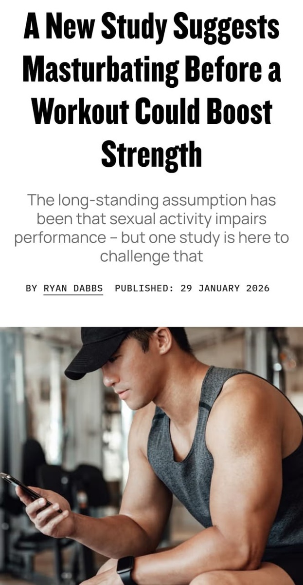 Спортсменам годами внушали, что перед тренировкой или соревнованиями нужно воздерживаться. Но исследования показывают обратное: сексуальная активность улучшает физические показатели. После мастурбации у молодых спортсменов выросла сила хвата, улучшилась выносливость на велосипеде, а уровень тестостерона поднялся. Дома качаем правую руку, в зале — левую 🙂 CtrlAltDelights- подписаться