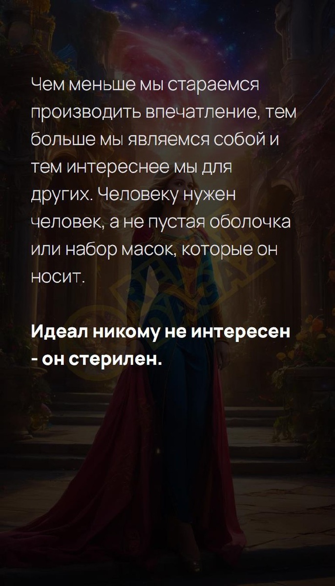 Чем меньше мы стараемся производить впечатление, тем больше мы являемся собой и тем интереснее мы для других. Человеку нужен человек, а не пустая оболочка или набор масок, которые он носит. Идеал никому не интересен - он стерилен. Архитектура вашей души | Архитектура вашей души T | VK | Pin | YouTub | Dzen #ясностьмысли #человечность #притяжение #новоесознание #поддержка #какстатьсчастливым #встреча #заботаосебе #отношения #9число #9февраля
