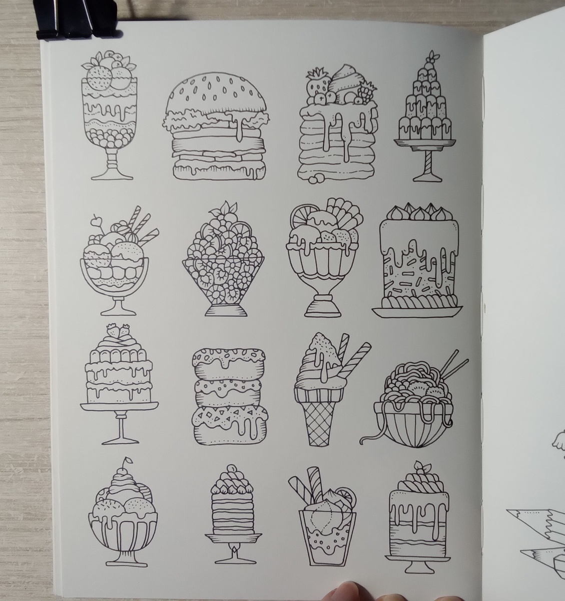 Вспомнила, что в Small Victories Джоанны Бэсфорд было что-то подходящее. Да, точно. Целая страничка со всевозможными лакомствами. Смотрите, даже бургер есть. Остановила свой выбор на этой иллюстрации, не стала искать ничего другого.