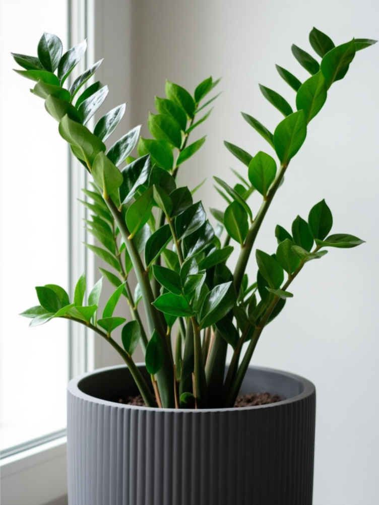 Глянцевые, темно-зеленые листья замиокулькаса выглядят стильно и дорого. Он растет медленно и основательно, как и положено солидному проекту.