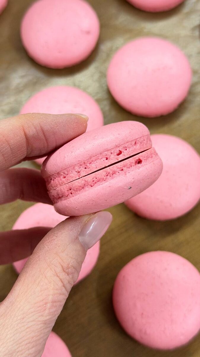 ! 💗🌸💗🌸💗🌸💗🌸💗 Розовые красивые крышечки! Краситель выбрала «красный вишневый»❤️🍒 В этот раз была одна из любимой миндальной муки - Калифорния! Она мелкая, но по сухости/влажности средняя, ближе к влажной. Я ее обычно не сушу. Использую другие способы корректировки процесса приготовления. 🍒меренгу взбиваю чуть стабильнее 🍒подсушиваю подольше. Вместо обычных 15 минут, сушу 40. И вот результат высокие красивые юбочки #макаронс #макаронсмосква #обучениемакаронс