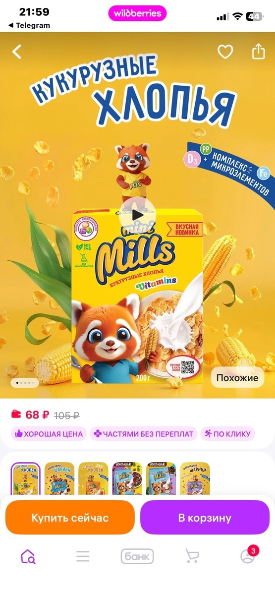 Mini Mills Готовые завтраки кукурузные хлопья обогащенные, 200гр