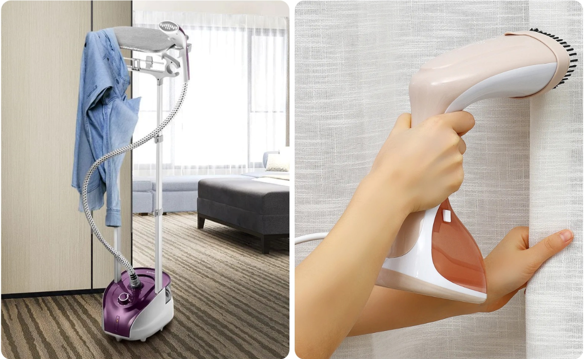 Тип конструкции. Существуют два вида отпаривателей: ручные и напольные (вертикальные). Ручные модели — компактные, легкие, с маленьким резервуаром для воды. Они подходят для небольших задач: например, ручным отпаривателем можно освежить подушки, а вот разглаживать шторы будет неудобно. Зато такое устройство занимает минимум места.