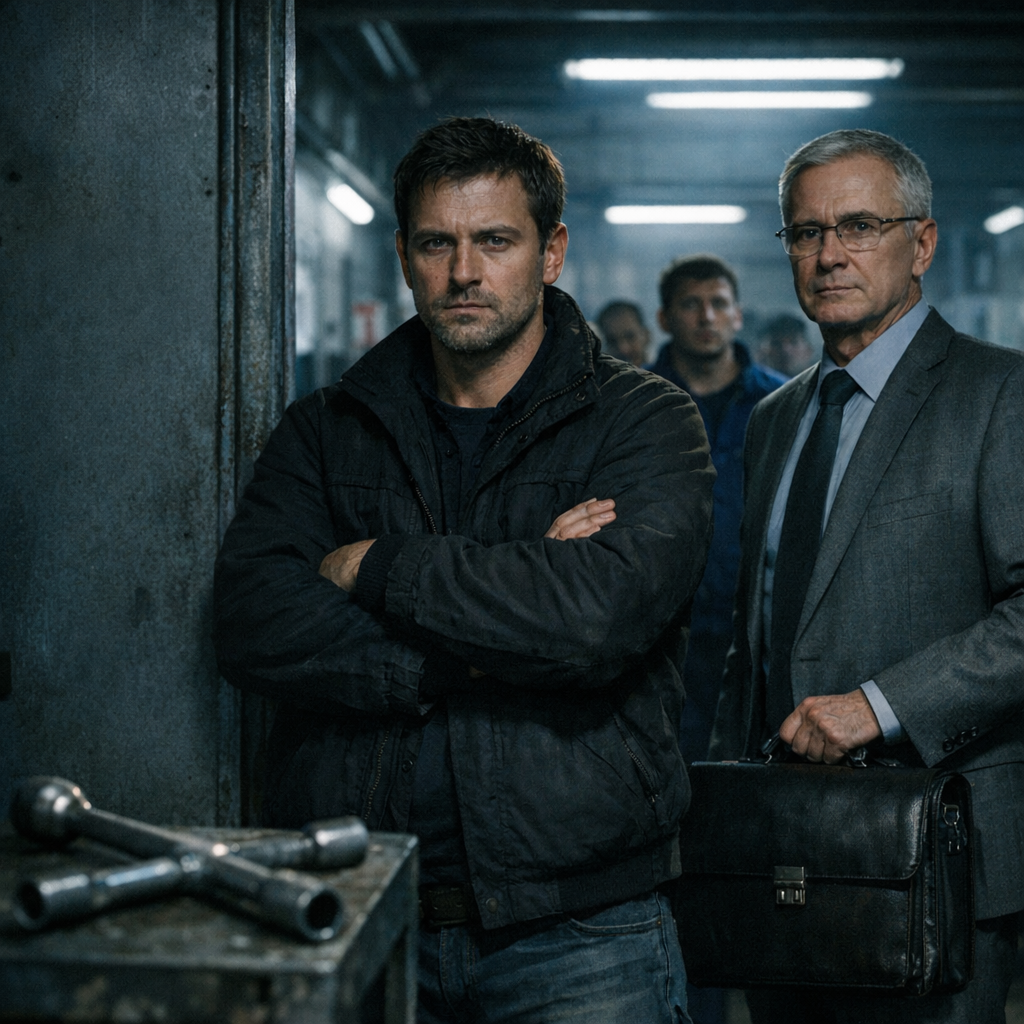 Я встал у двери бокса. Руки в карманах. Баллонный ключ из багажника лежал на стойке приёмки — я его туда положил, когда вошёл. Не как угроза. Как экспонат.