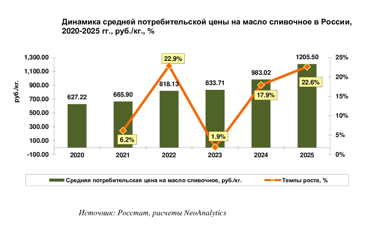 В ходе ежемесячного мониторинга розничных (потребительских) цен за масло сливочное, проведенного NeoAnalytics, выяснилось, что в 2025 г. масло сливочное подорожало в два раза по сравнению с 2020 г. Объектом исследования являются средние цены на масло сливочное соленое и несоленое, сладко-сливочное, без наполнителей, весовое или фасованное, не менее 72,5% жирности (без растительных жиров). Виды продукции, пользующиеся наибольшим спросом, типа «Экомилк», «Президент», «Вкуснотеево», «Вологодское», «Крестьянское» и др. Кроме масла шоколадного, селедочного, фруктово-ягодного, козьего и т.п., руб. за кг. Таким образом, по итогам 2025 г. средняя потребительская цена на один кг. масла сливочного продемонстрировала рост в 22,6% относительно аналогичного показателя годом ранее и составила 1 205,5 руб. Для сравнения, еще в 2020 г. масло сливочное можно было купить за 627,22 руб./кг., а в 2025 г. - уже по 1,2 тыс. за кг. Рост ощутимый. Помесячная динамика периода 2020-2025 гг. показывает, что сред