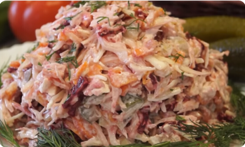 Этот салат — отличный способ разнообразить повседневное меню. Он получается насыщенным, сочным и очень сытным за счет курицы и обжаренных овощей. При этом он легкий и свежий благодаря капусте и маринованному огурцу. Его можно приготовить заранее, он хорошо хранится в холодильнике. Простая комбинация знакомых продуктов дает по-настоящему новый и приятный вкус, который хорошо подходит и для семейного ужина, и для приема гостей.
