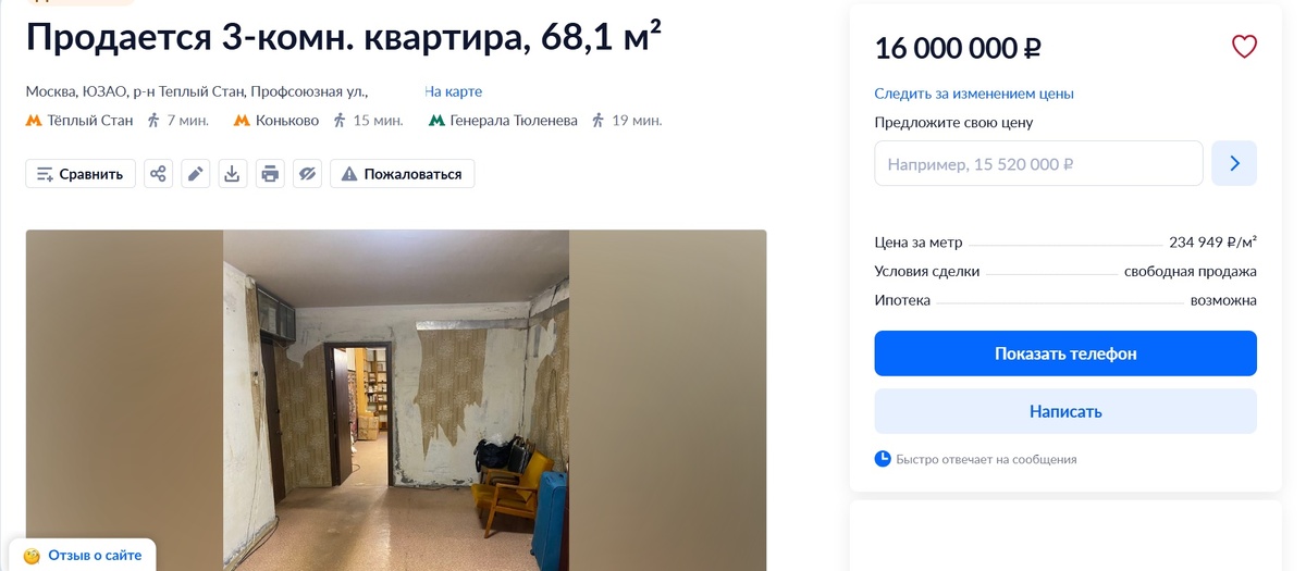 Как всегда по понедельникам обзор пятерки самых доступных по цене квартир в ЮЗАО. На этот раз рассмотрю “трешки”. Там продолжается ностальгия - попадаются цены “из прошлого”. Приятно посмотреть! 🙂 Условия прежние - внутри МКАД, НЕ первый этаж, дома от 9 этажей, разумная доступность от метро. Без аукционов, то есть квартиру можно купить по цене в рекламе. На первом месте, по давней традиции, “трешка” в Теплом Стане, в конце Профсоюзной улицы, неподалеку от МКАД. Квартира в жутком состоянии. Фото любительские, их много, но я не понял главное - где балкон? Планировки нет, но судя по типу дома он должен быть. Дом с газом. В таких домах в “трешках” один балкон. В описании также про балкон ничего, но есть про документы - квартира в одной семье, но одна из долей это свежее наследство. В принципе - ничего страшного. Зачем-то прибавили площадь, причем от души. В домах этой серии она около 60м2, тут аж 68. Когда же это закончится? :)) Цена 235к за м2 не соответствует действительности, т.к. не я