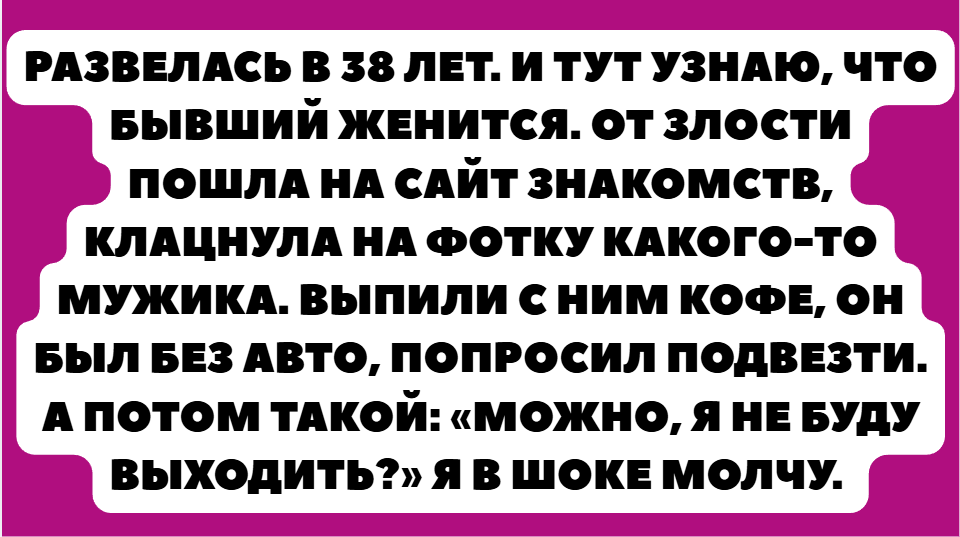 - Я в разводе. Один мужчина с сайта знакомств пригласил меня на свидание. Мы болтали без умолку, у нас оказалось много общего. И тут я поняла, что ни разу не упомянула о своих троих детях. У него-то своих не было. Рассказала ему, а он такой: «Ты не против встретиться снова?» Через полгода я познакомила его с детьми, а еще через полгода мы купили дом. Теперь мы женаты, и я чувствую себя счастливее, чем когда-либо. Дети его обожают! © Женечка