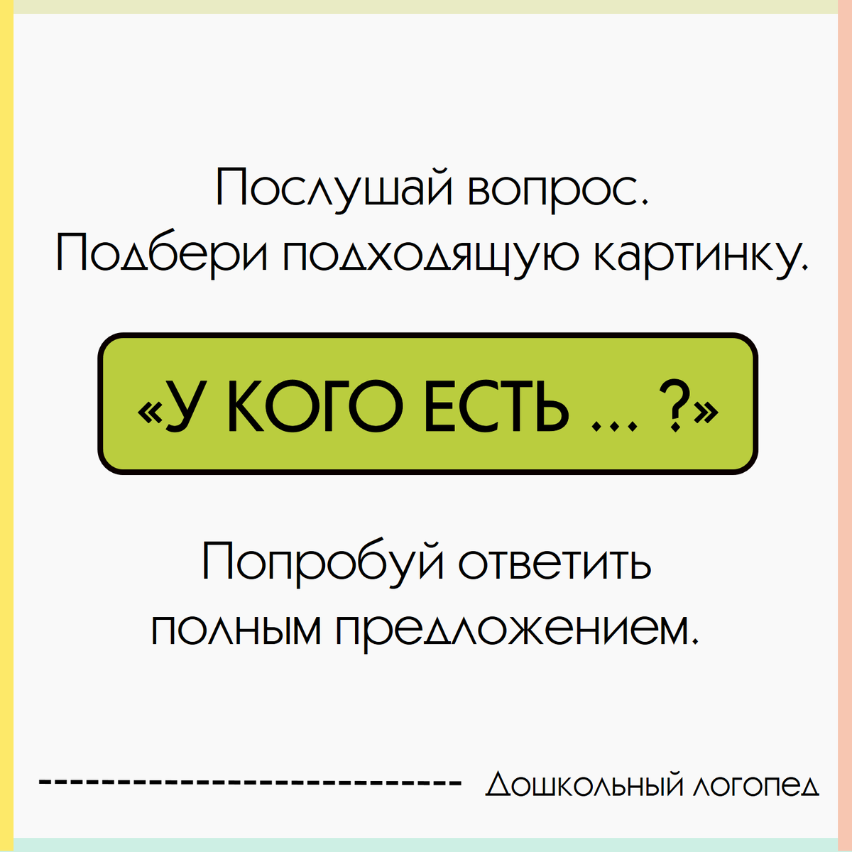 Ищите материалы для развития ребенка? Попробуйте игру "У кого есть ... ?". Подбирайте к вопросам подходящие картинки - просто и полезно! Прокачивайте наблюдательность и логику, обогащайте словарный запас. Понадобится всего пять минут. Играем?