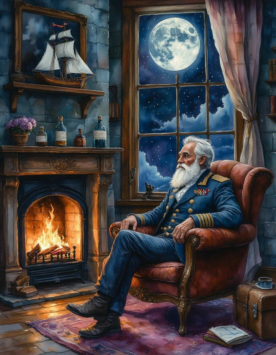 К старому речному капитану Ивану Петровичу, Буся пришла глубокой ночью. Он сидел в своем кресле у холодного камина и смотрел на кораблик в бутылке — символ мечты, которая так и не сбылась.
