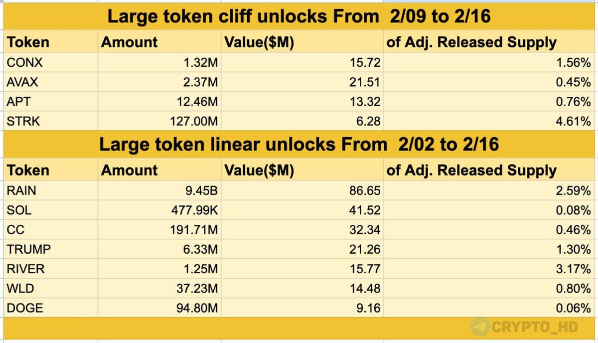 🔓 ТОП разблокировок токенов с 9 по 16 февраля! Cliff Unlocks: ▫️#CONX - $15,72m ▫️#AVAX - $21,51m ▫️#APT - $13,32m ▫️#STRK - $6,28m Linear Unlocks: ▫️#RAIN - $86,65m ▫️#SOL - $41,52m ▫️#CC - $32,34m ▫️#TRUMP - $21,26m ▫️#RIVER - $15,77m ▫️#WLD - $14,48m ▫️#DOGE - $9,16m P.S. Cliff Unlocks – разблокировка крупной порции токенов единовременно в конкретную дату. Linear Unlocks – постепенная разблокировка токенов в течение определенного периода (обычно каждый день или каждую неделю по части). Crypto Headlines