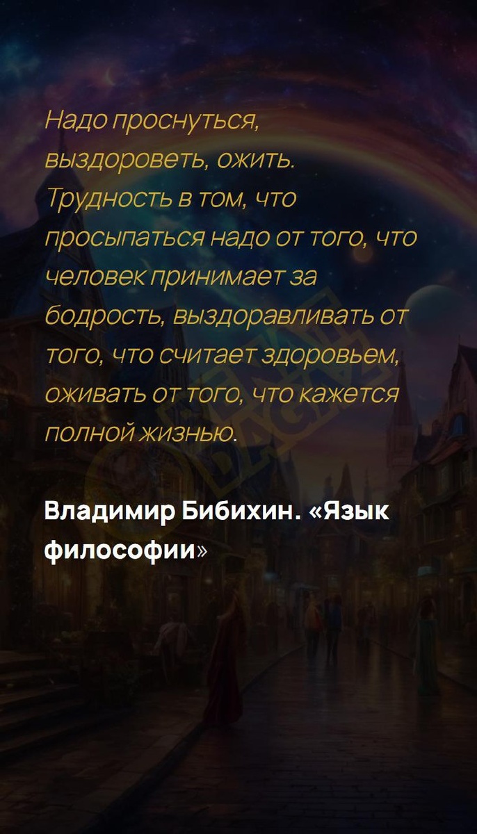 Трудность в том, что просы... Надо проснуться, выздороветь, ожить. Трудность в том, что просыпаться надо от того, что человек принимает за бодрость, выздоравливать от того, что считает здоровьем, оживать от того, что кажется полной жизнью. Владимир Бибихин. «Язык философии» Архитектура вашей души | Архитектура вашей души T | VK | Pin | YouTub | Dzen #осознанноебытие #трансформацияличности #психологияженщины #моицели #ментальноездоровье #денежныйпоток #позитивноемышление #притяжение #советдня #10число #10февраля