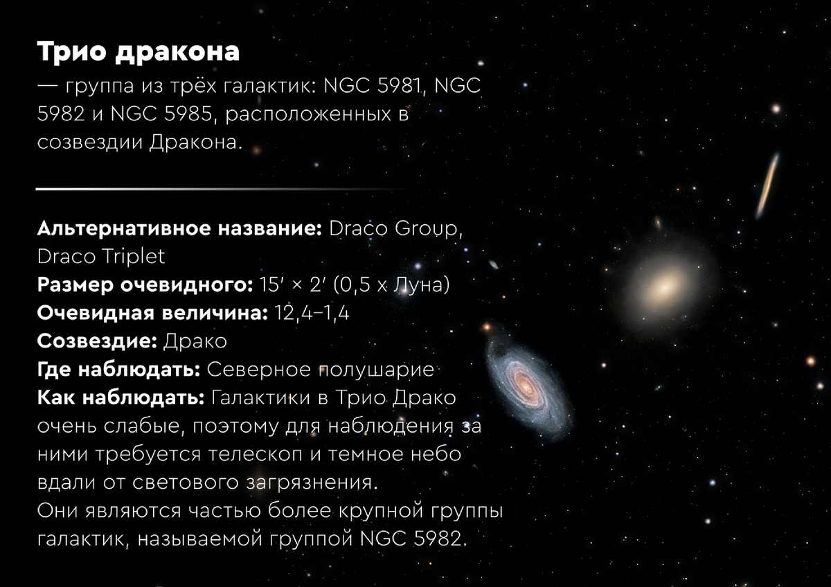 В майские ночи, когда воздух в средней полосе России еще хранит прохладу, а кромешную темноту уже разгоняют лучи летнего солнцестояния, взгляд устремленного ввысь наблюдателя может наткнуться на настоящее сокровище. Высоко над головой, почти в зените, в извивах созвездия Дракона, таится одна из самых изящных и контрастных группировок далеких звездных миров, известная среди астрономов-любителей как «Трио Дракона». NGC 5981, NGC 5982 и NGC 5985 — три галактики, собравшиеся на клочке неба размером с лунный диск, будто для небесной фотосессии. Но эта близость — лишь игра перспективы, оптическая иллюзия, за которой скрываются глубинные, почти философские истории о жизни, смерти и перерождении этих трех соседок.