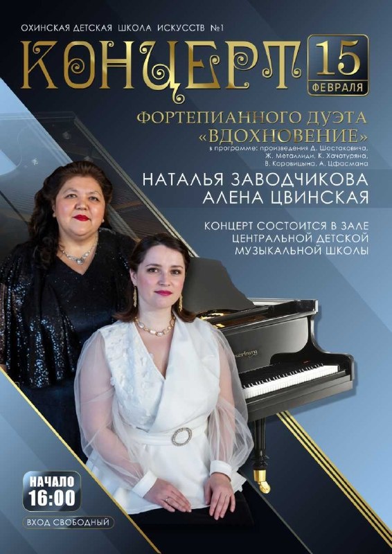 ! 🎹✨ Приглашаем учеников, преподавателей и родителей на концерт наших гостей из Охинской детской школы искусств №1 - фортепианного дуэта «Вдохновение». 🎶 Для вас выступят Заслуженный работник культуры РФ, Заслуженный педагог Сахалинской области Наталья Анатольевна Заводчикова и педагог Алена Владимировна Цвинская. 🎼 В программе прозвучат произведения Д. Шостаковича, Ж. Металлиди, К. Хачатуряна, В. Коровицына, А. Цфосмана. 📆15 февраля, 16.00 📍Малый зал ЦДМШ (Невельская, 47, аудит.308) 🎟️ Вход свободный