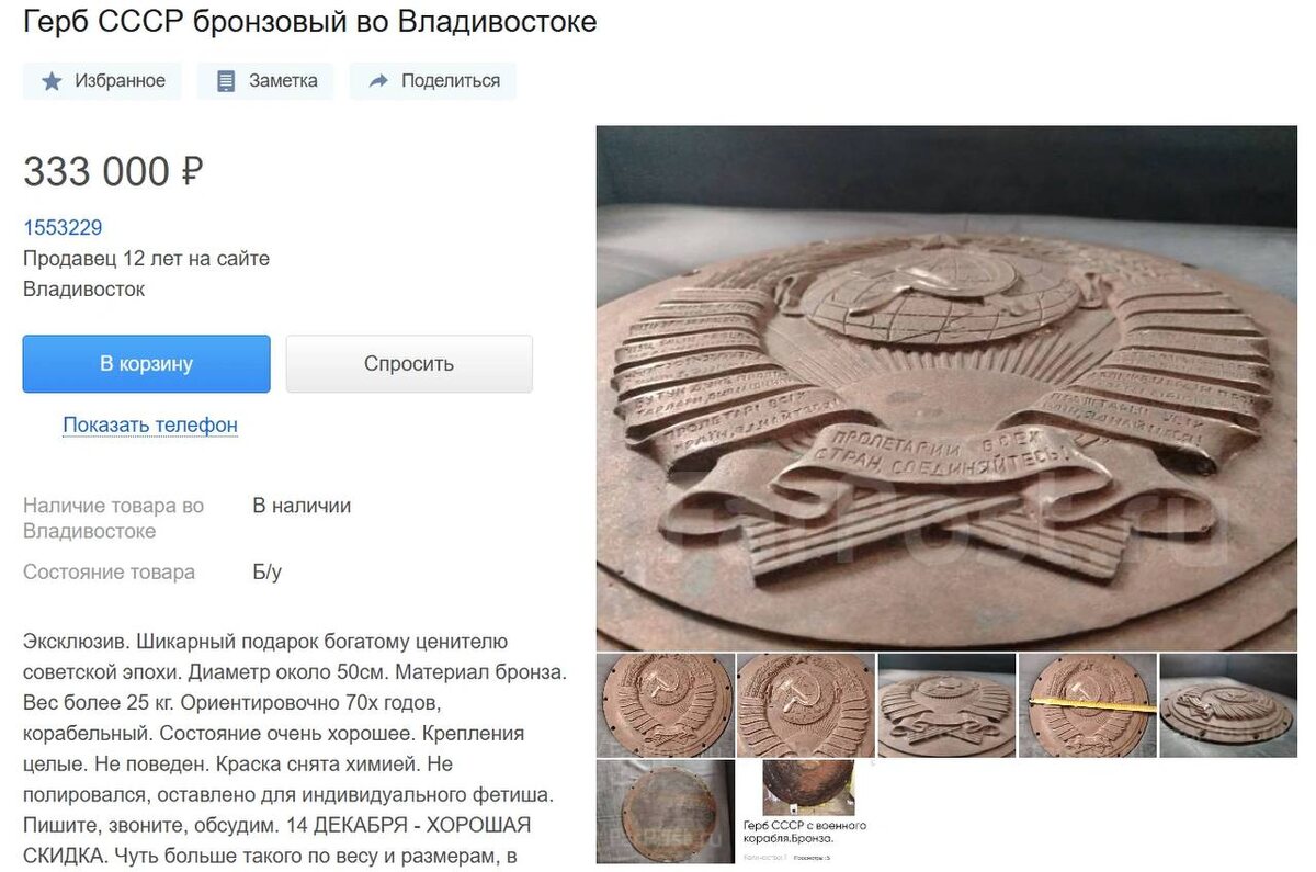 Эксклюзивный бронзовый герб СССР весом в 25 килограммов продают во Владивостоке на Farpost