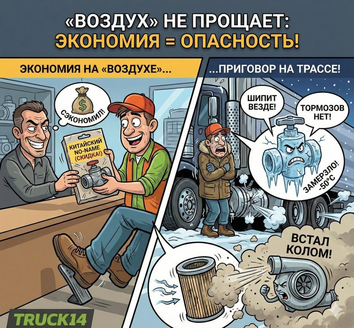 Если дешевый фонарь просто перегорит, то заклинивший главный тормозной или четырехконтурный кран на трассе — это реальная угроза жизни (или как минимум — «колом» вставшая машина в мороз). Я провел фактчекинг по техническим материалам Wabco, Knorr-Bremse и отзывам сервисных центров по пневмосистемам. Основные проблемы дешевых аналогов: Качество РТИ (Резинотехнических изделий): Это самое слабое место. Дешевая резина «дубеет» уже при -20°C. Для Якутии это приговор. Точность литья: В дешевых кранах часто встречаются микротрещины в корпусе или заусенцы внутри, которые рвут манжеты за неделю работы. Электрика: В кранах с электронным управлением (EBS, ECAS) дешевые соленоиды негерметичны, плата окисляется от конденсата моментально. Вот готовый пост: 🛑 «Воздух» не прощает: какие пневмоклапаны лучше обходить стороной Пневмосистема грузовика — это его вены. Чуть стравило воздух — и машина либо не едет (блокировка), либо не тормозит. Соблазн купить кран за 3 000 руб. вместо оригинала за 1