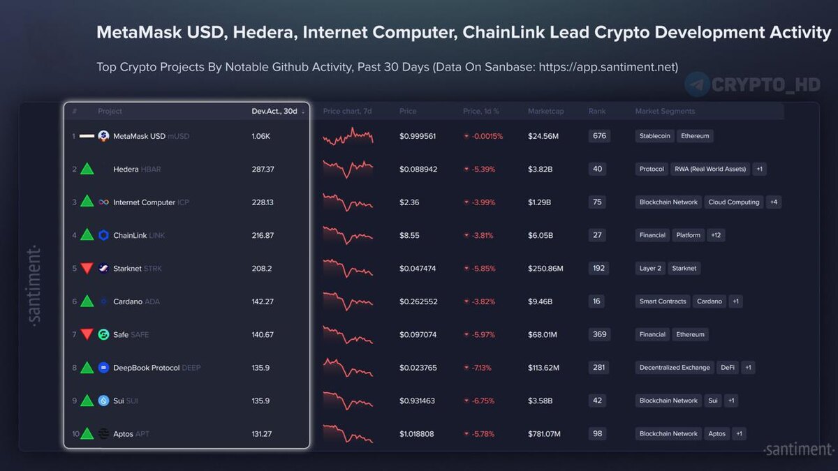 📊 Santiment: ТОП-10 криптопроектов по активности разработчиков за последние 30 дней. 1. MetaMask USD #mUSD 2. Hedera #HBAR 3. Internet Computer #ICP 4. ChainLink #LINK 5. Starknet #STRK 6. Cardano #ADA 7. Safe #SAFE 8. DeepBook Protocol #DEEP 9. Sui #SUI 10. Aptos #APT Ранее: прошлый топ Crypto Headlines