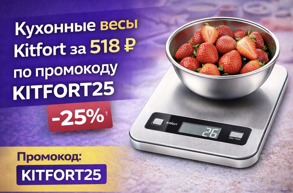 Кухонные весы — как раз из таких: меньше “на глаз”, больше стабильного результата. Kitfort КТ-857-4 сейчас можно взять за 518 ₽ со скидкой −25% по промокоду KITFORT25 — отличная цена для вещи, которая реально помогает каждый день. Даже простые рецепты “прыгают”, если мерить ложками и стаканами.