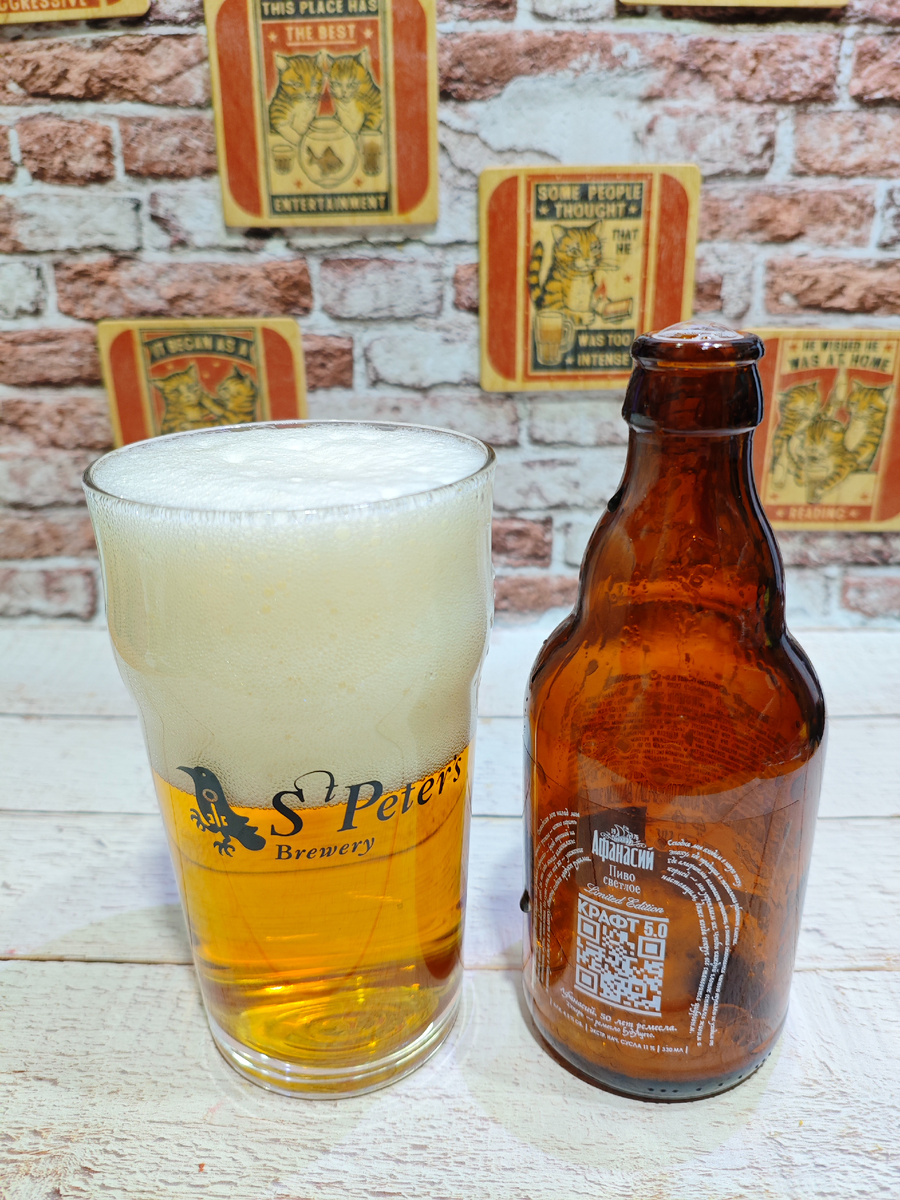 Изготовитель: ООО "Частная пивоварня "Афанасий", г. Тверь Тверской области. На сайте пивоварни этого сорта я не нашёл. На UNTAPPD описания нет. На момент публикации у пиваса 11 чекинов; первый датирован 24 декабря 2025 года. ********************************************************************************** Плотность: 11%. Состав: вода питьевая, солод пивоваренный ячменный светлый, хмель, хмелепродукты. Срок годности: 240 суток при температуре хранения от +5℃ до +25℃. С даты розлива моей бутылки прошло чуть более 2-х месяцев. ********************************************************************************** Пена пышная и раствориться не спешит. Аромат солодовый с лёгким но хорошо обозначенным приятным цитрусовым оттенком, настраивающим на позитивный лад. Карбонизация умеренная. Вкус сладковатый солодовый с выраженным чуть горьковатым травяным привкусом и лёгким ненавязчивым цитрусовым оттенком. На конце глотка солодово-лимонная кислинка. Послевкусие сладковатое с небольшой горчинкой. К