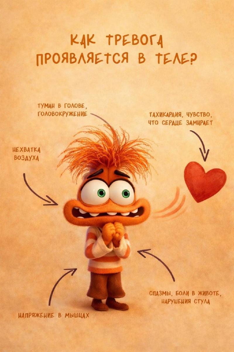 ? Добрый день, друзья! Продолжаем наш разговор про тревогу. В прошлый раз мы договорились прислушаться к своим ощущениям. Сегодня будем расшифровывать сигналы тела. Потому что тревога редко говорит нам прямо: «Привет, я здесь!». Чаще она прячется за физическими ощущениями. Как может «звучать» тревога в теле? 🟠Дыхание: стало поверхностным, задержалось, появилась зевота или вздохи «полной грудью» 🟠Сердце: заколотилось, «замерло» или «упало» при мысли о дедлайне или предстоящей встрече 🟠Мышцы: напряжение в плечах, шее, челюсти (можете прямо сейчас их проверить?) 🟠Желудок: «сосёт под ложечкой», спазмы, тошнота перед важной задачей 🟠Руки/ноги: дрожь, холодные пальцы, беспокойные движения (трудно усидеть на месте) 🟠Голова: туман, тяжесть, давление в висках или лёгкое головокружение 🟠Горло: «ком», сухость, изменение голоса Важное правило ⬇️ Эти сигналы не враги. Это ваш организм искренне пытается вам что-то сообщить: «Эй, ситуация кажется мне угрожающей! Может, стоит остановиться и