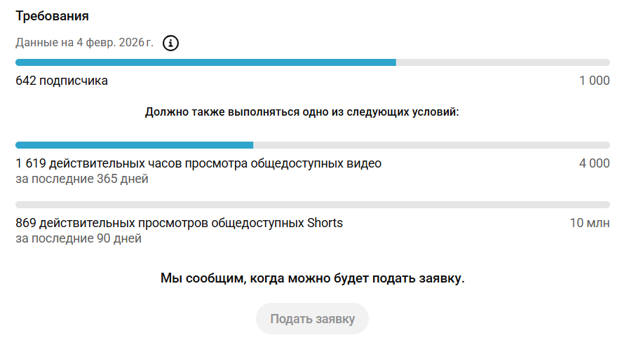 В сегодняшней статье я кратко расскажу о том, какие требования у Ютуба в авторам для подачи заявки на монетизацию в 2026 году и дам небольшие рекомендации, которые помогут вам набрать необходимые показатели. Требования для подачи заявки не менялись уже очень давно. Лишь в 2022 году появился альтернативный способ получения монетизации. Итак, первое требование: Вам нужно набрать 1000 подписчиков на своём Ютуб канале. Неважно, все они смотрят видео, или будет активной только 30%. Главное - цифра. Второе требование даёт вам выбор, через что вы хотите выйти на монетизацию. Можно как через Видео, так и через Shorts. Для подачи заявки через Видеоформат нужно накопить за 1 год 4000 часов просмотров именно на Видеоформате. В случае с Шортсами ситуация куда жёстче: необходимо набрать 10 миллионов заинтересованных просмотров за 90 дней, именно на Шортсах. Просмотры видео не учитываются. Заинтересованные просмотры, это не тоже самое, что и обычные. В среднем заинтересованных просмотров в 2 раза ме