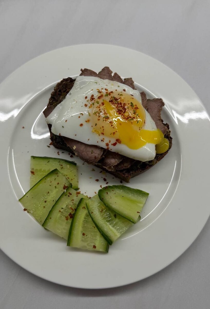 … Зерновой хлеб с песто и говядиной, плюс яйцо – это божественно.
