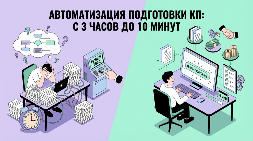 Три часа на одно коммерческое предложение — это не редкость. Менеджер открывает Excel, копирует старый шаблон, вручную меняет цены, считает итоги на калькуляторе, ищет актуальные фотографии товаров, форматирует таблицы. К концу дня на 2-3 КП уходит весь рабочий день, а клиенты ждут ответа.