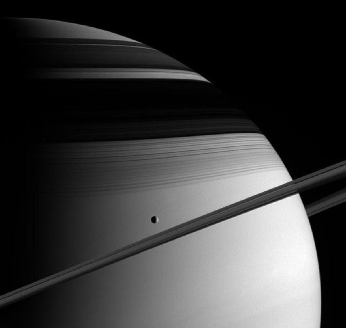 С ледяного спутника Тефия открывается фантастический вид на систему Сатурна, его кольца и отбрасываемые ими тени. Освещенная Солнцем Тефия видна немного левее и ниже центра фотографии, сделанной в 2005 году. Ее диаметр около тысячи километров, а ее орбита удалена от центра гигантской газовой планеты на расстояние, примерно равное пяти радиусам Сатурна. На таком расстоянии она находится далеко за пределами основных ярких колец Сатурна. Все же Тефия – один из пяти спутников, которые расположены внутри границы слабо светящегося разреженного внешнего кольца Е. Два очень маленьких спутника Телесто и Калипсо, открытые в 1980-е годы, находятся в устойчивых положениях вдоль орбиты Тефии. Терра инкогнита | Неизвестная земля