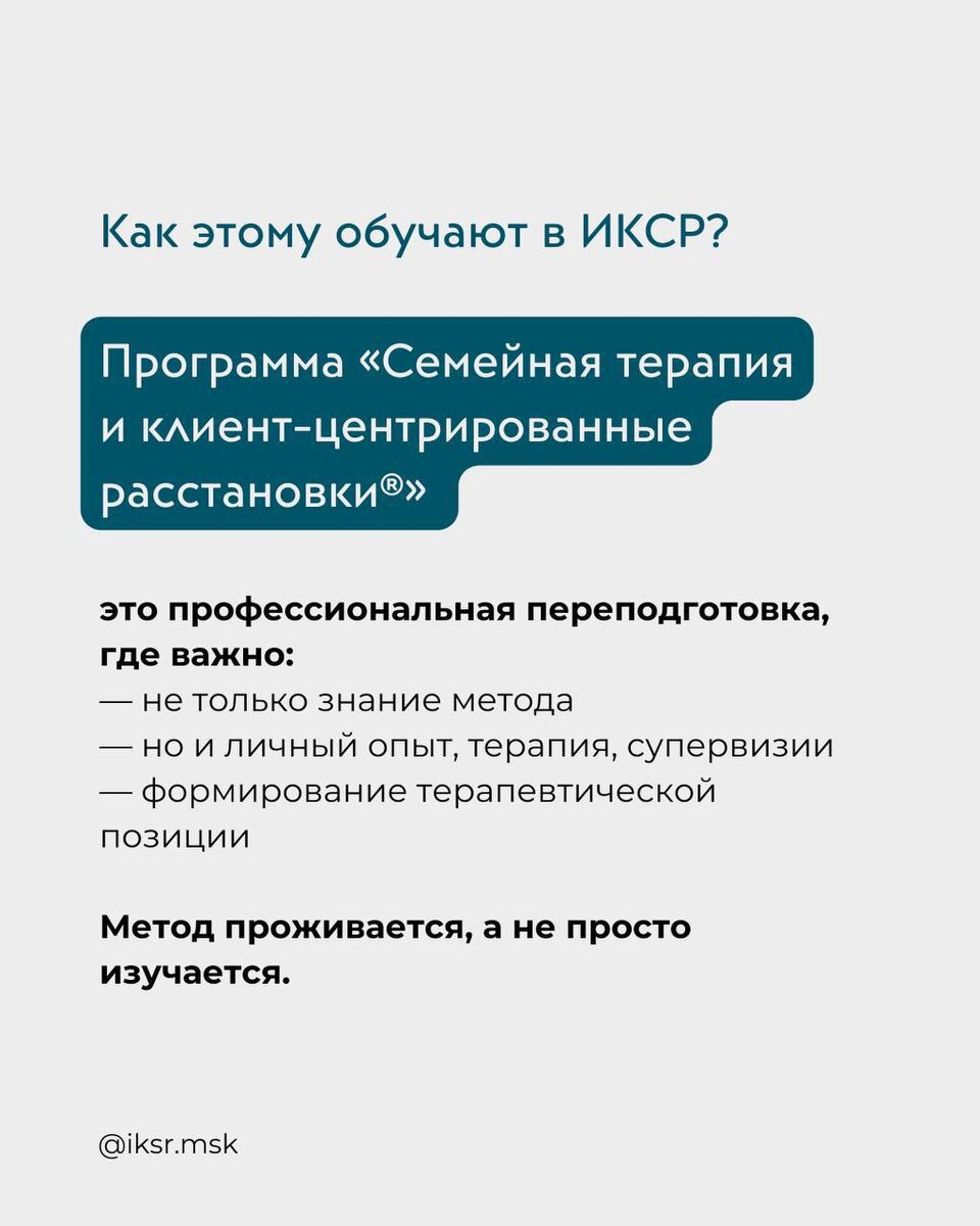 Отношения, из которых сложно выйти. Семейные конфликты, которые будто ходят по кругу. Разговоры, после которых становится только тяжелее. ⠀ Часто корни таких трудностей уходят не только в личность, а в систему отношений, частью которой человек является. В терапии мы видим, как за повторяющимися сценариями стоят перепутанные роли, бессознательные лояльности, непрожитые потери и попытки сохранить связь любой ценой — даже если она разрушает. ⠀ Клиент-центрированные расстановки® позволяют работать с этим уровнем. Не обвиняя, не ломая и не подменяя смыслы клиента. ⠀ В поле становится видно, где заканчивается его собственная история, и где начинается чужая. Где он удерживает то, что давно не принадлежит ему, и где возможны изменения без насилия над собой. ⠀ Именно так терапия перестаёт быть бесконечным анализом и становится процессом возвращения человеку его места, границ и опоры. Этому подходу мы обучаем в программе переподготовки ИКСР «Семейная терапия и клиент-центрированные расстановки®»