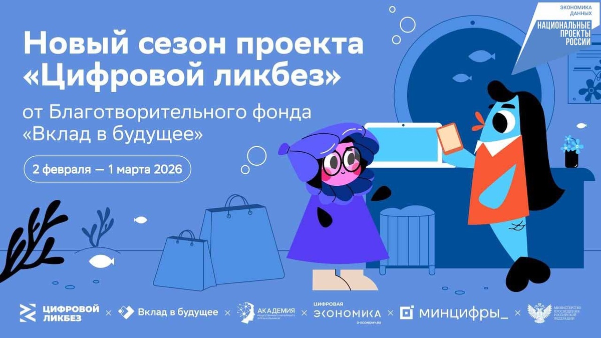 Цикл занятий по цифровой грамотности и кибербезопасности от Благотворительного фонда «Вклад в будущее» пройдёт со 2 февраля по 1 марта. Проект реализуется АНО «Цифровая экономика» совместно с Минцифры России и Минпросвещения России в поддержку федерального проекта «Кадры для цифровой экономики» нацпроекта «Цифровая экономика», а также нового национального проекта «Экономика данных». «Цифровой ликбез» – просветительский проект, который помогает детям и взрослым повысить цифровую грамотность и узнать больше о кибербезопасности в сети. Он состоит из серии просветительских мультипликационных роликов и методических материалов для педагогов. Видеоролики для него создают ведущие цифровые компании-лидеры: Благотворительный фонд «Вклад в будущее», VK, СКБ Контур, «Лаборатория Касперского», Авито, Яндекс, «Ростелеком» и другие. Подробности читайте на сайте: https://vk.cc/cUd0Jt