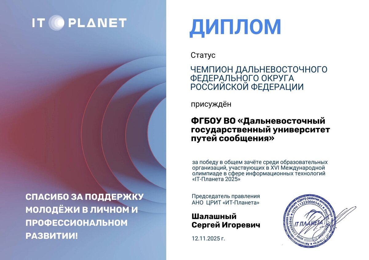 ДВГУПС– чемпион Дальневосточного федерального округа Российской Федерации в общем зачете XVI Международной олимпиады «IT-планета 2025