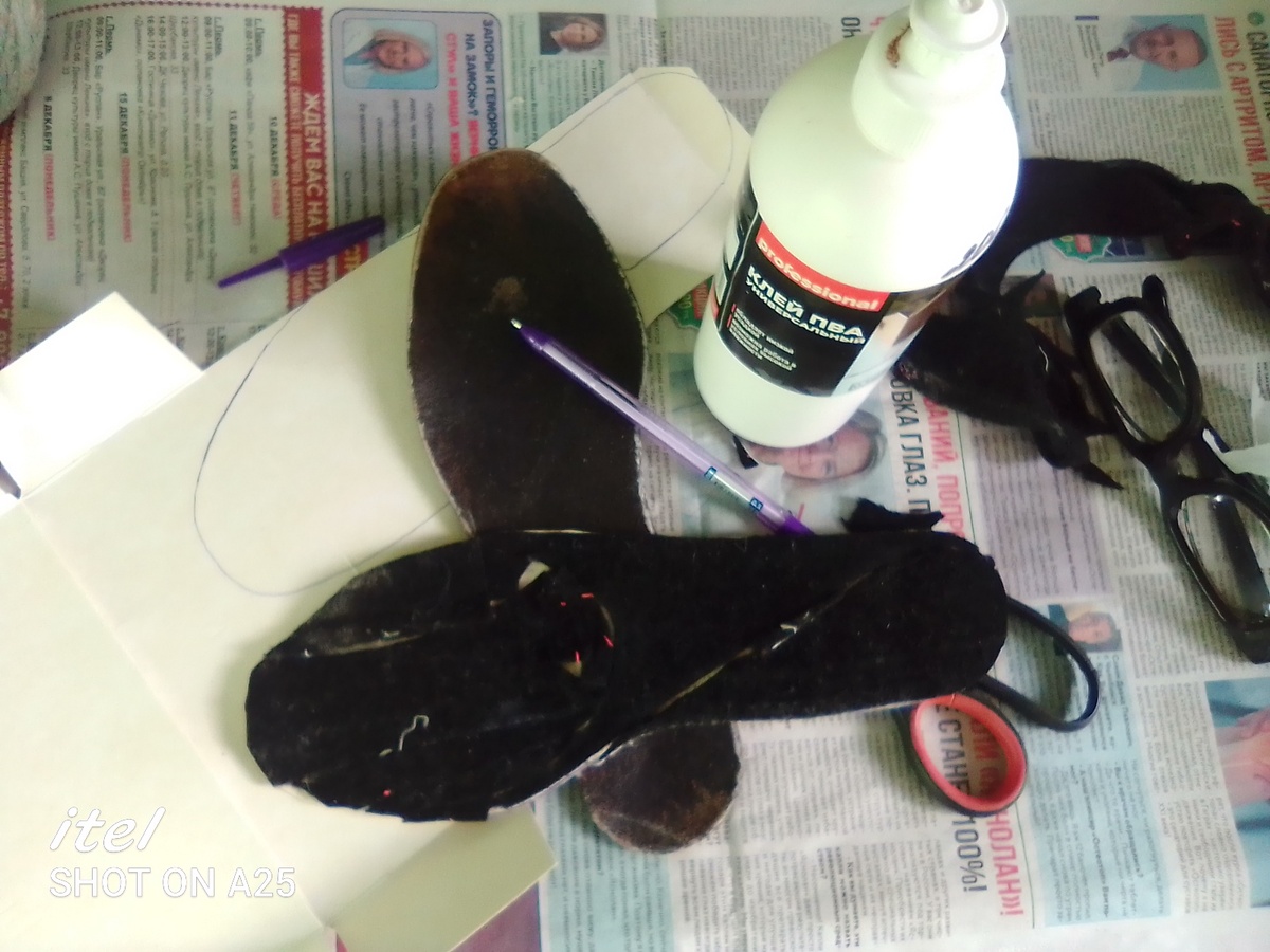 Взял упаковку из под чая. Вырезал по лекалу( в качестве лекала использовал кожаную стельку). При помощи клея ПВА наклеил кусочки драпа.