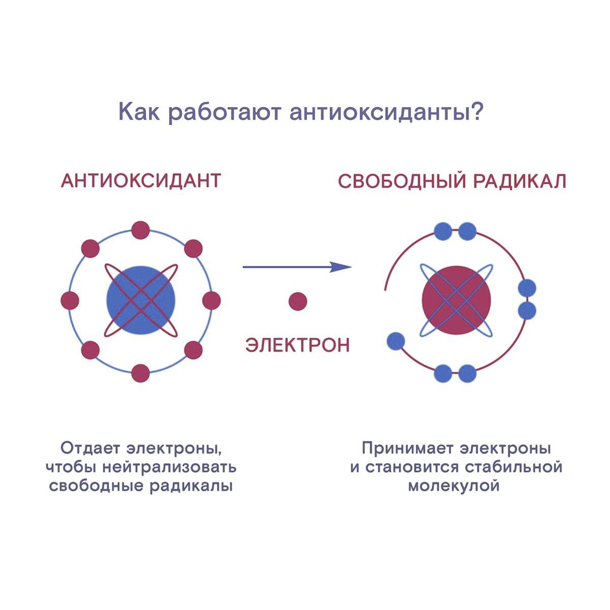 Антиоксиданты — это «природные защитники» клеток, которые нейтрализуют вредные вещества - свободные радикалы. Что такое свободные радикалы? Это нестабильные молекулы с «непарным» электроном. Чтобы стать стабильными, они «отнимают» электроны у других молекул — клеток, белков, жиров или даже ДНК. В результате: ❌повреждаются клеточные структуры; ❌запускаются цепные реакции разрушения; ❌возникает окислительный стресс, который ведёт к болезням и старению. В защиту свободных радикалов нужно сказать, что они выполняют и полезную функцию. Например, иммунные клетки используют их для борьбы с некоторыми инфекционными заболеваниями. Как работают антиоксиданты? Они отдают свой электрон свободному радикалу. Так они: 👍останавливают цепную реакцию окисления; 👍превращают агрессивные радикалы в безопасные вещества (воду, кислород); 👍помогают восстанавливать повреждённые молекулы. Одними из представителями антиоксидантной системы являются витамины А, Е и С. 🥗 Твой личный нутрициолог