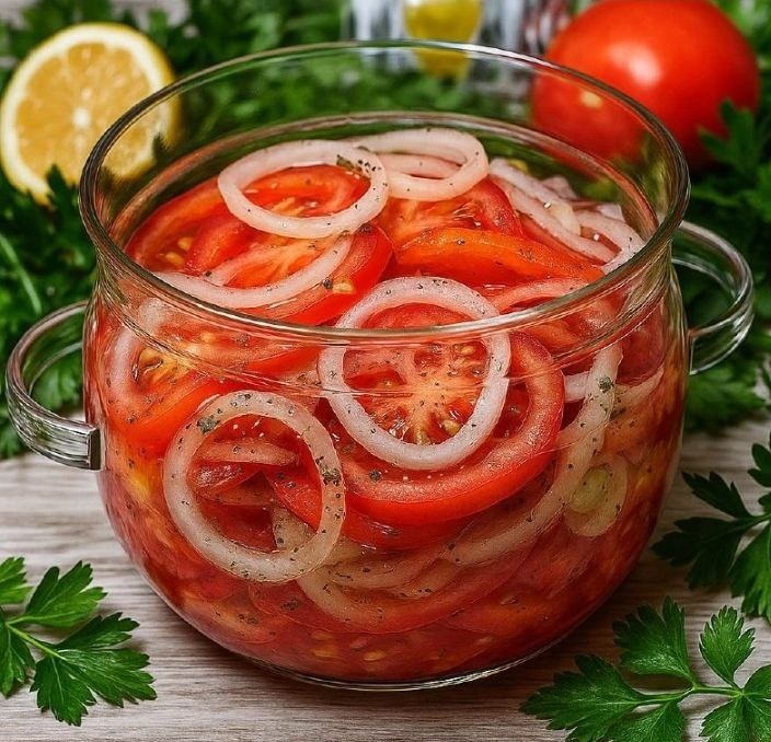 Простая, но "ходовая" закуска, которую у нас в семье делают каждое лето. Чем дольше стоит — тем вкуснее, аромат насыщенный, маринад яркий, а сами помидоры тают во рту. Обязательно попробуйте! ИНГРЕДИЕНТЫ: ✅ Помидоры — 1 кг ✅ Лук репчатый — 2 шт. ✅ Базилик свежий — 1 пучок ✅ Чеснок — 3 зубчика ✅ Соль — 1 ст. л. ✅ Сахар — 1,5 ст. л. ✅ Уксус 9% — 2 ст. л. ✅ Вода — 150 мл ✅ Масло растительное — 4 ст. л. ПРИГОТОВЛЕНИЕ: 1. Помидоры нарежьте кружочками или дольками. Лук — тонкими полукольцами, чеснок — пластинками. Базилик порвите руками. 2. В глубокой миске уложите слоями помидоры, лук, чеснок и базилик. 3. Смешайте воду, масло, уксус, сахар и соль. Прогрейте маринад до полного растворения сахара и соли, остудите. 4. Залейте овощи маринадом, накройте крышкой или плёнкой и уберите в холодильник минимум на 4–5 часов, а лучше на ночь. СОВЕТЫ • Подавать можно к мясу, рыбе, картофелю или просто с хлебом. • Удобно готовить в банке — и хранить, и подавать легко. • Вместо базилика можно взять кин