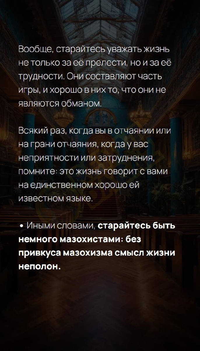 Вообще, старайтесь уважать жизнь не только за её прелести, но и за её трудности. Они составляют часть игры, и хорошо в них то, что они не являются обманом. Всякий раз, когда вы в отчаянии или на грани отчаяния, когда у вас неприятности или затруднения, помните: это жизнь говорит с вами на единственном хорошо ей известном языке. • Иными словами, старайтесь быть немного мазохистами: без привкуса мазохизма смысл жизни неполон. Архитектура вашей души | Архитектура вашей души T | VK | Pin | YouTub | Dzen #мысль #энергияжизни #верьвсебя #улыбка #берегисебя #подсознаниеможетвсе #витальность #удача #витальность #10число #10февраля